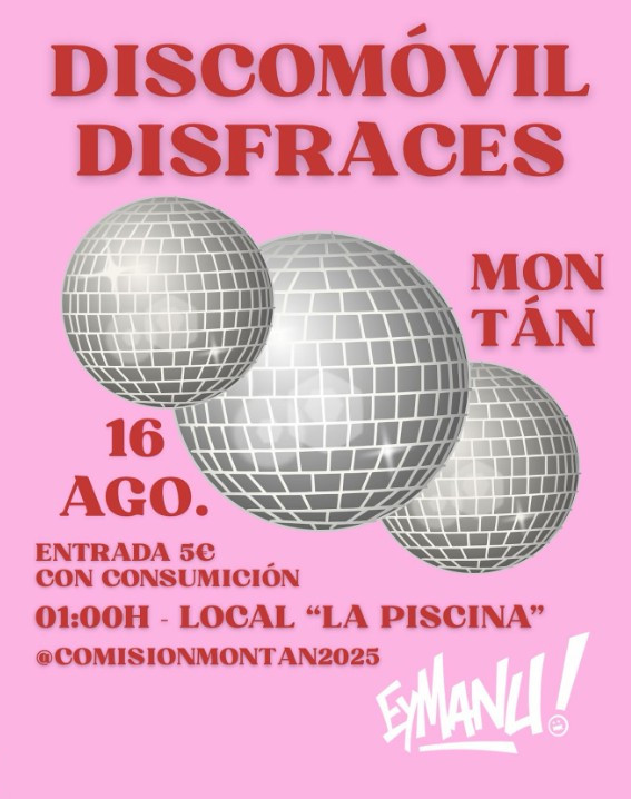 📅 Sábado 16 de agosto 📍 Local «La Piscina» – Montán 🎧 01:00 Discomóvil con EyManu! 🎟️ Entrada: 5€ con consumición