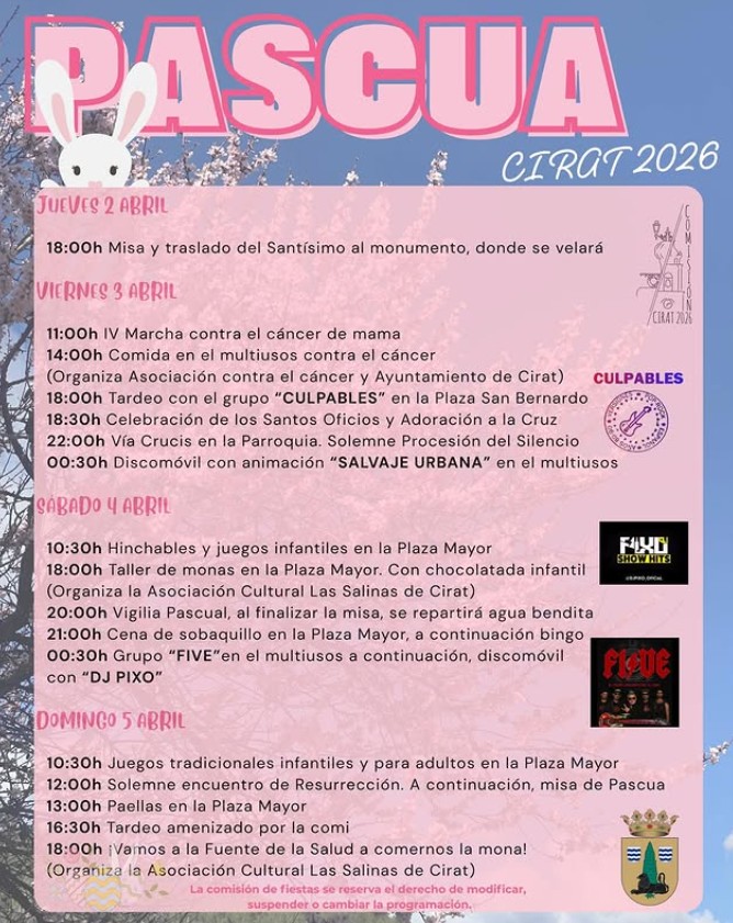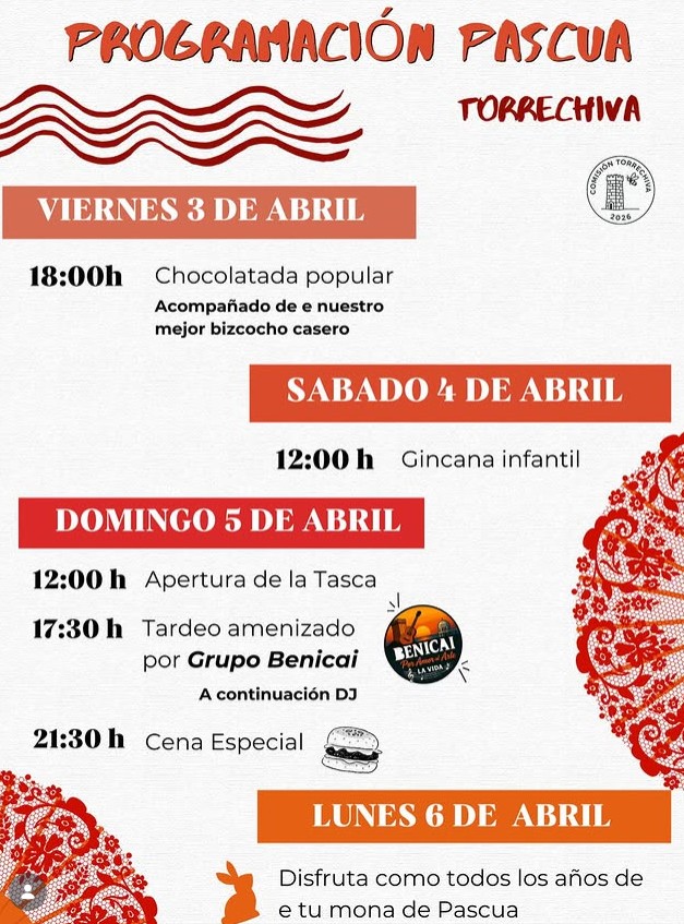 Programación Pascua 2026 - Torrechiva Viernes 3 de abril 18:00 - Chocolatada popular con bizcocho casero Sábado 4 de abril […]