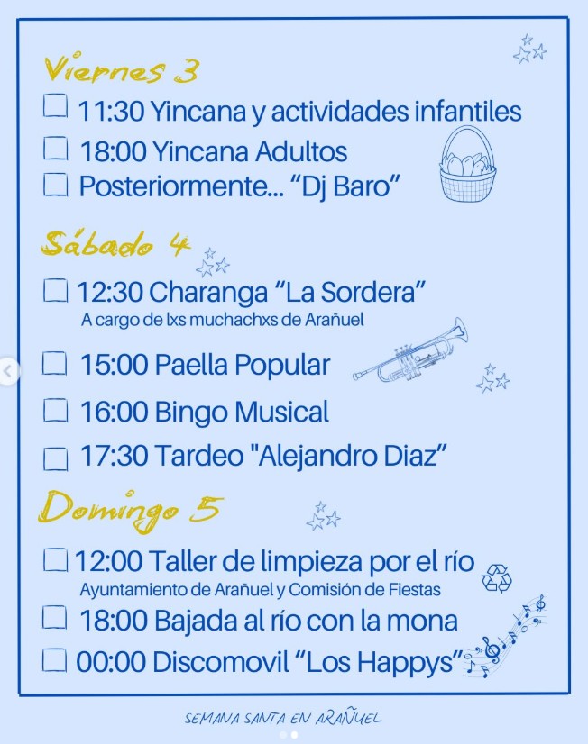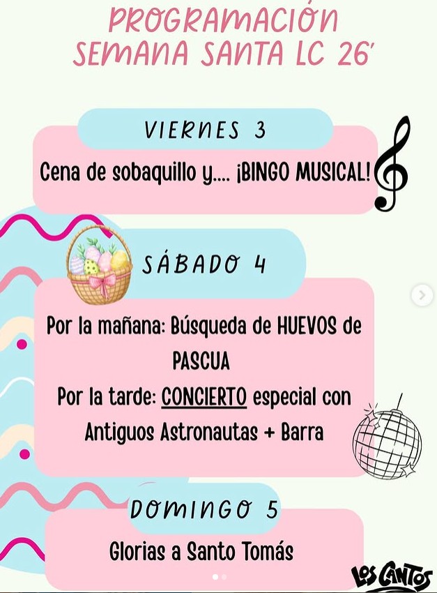 Viernes 3 de abril Cena de sobaquillo ¡BINGO MUSICAL! Sábado 4 de abril Mañana: Búsqueda de HUEVOS de PASCUA Tarde: […]